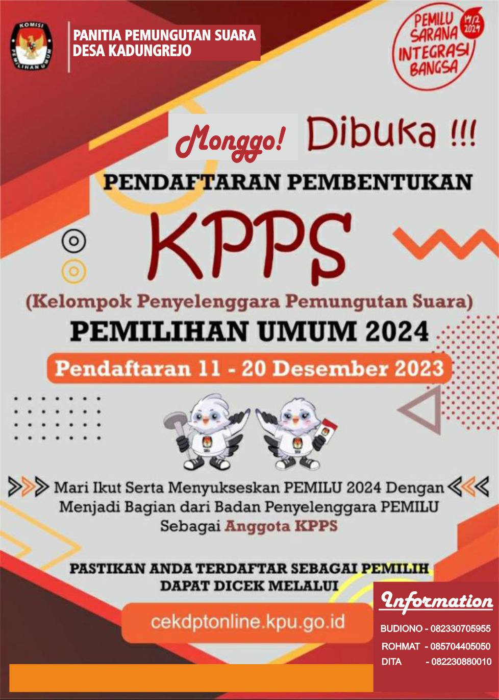 Telah dibuka Pendaftaran KPPS Desa Kadungrejo Tanggal 11 - 20 Desember 2023Download Surat Pengumumaan : https://mediapps.kadungrejo.com/download/file/pdfresizer_com-pdf-resize.pdfDownload Surat Pendaftaran : . . .